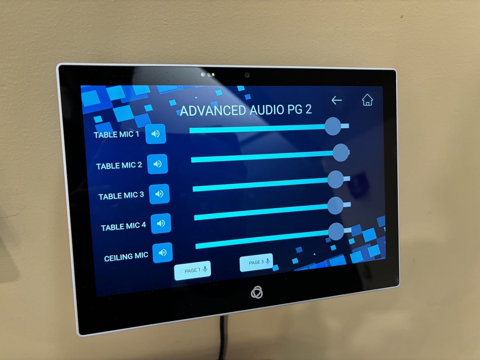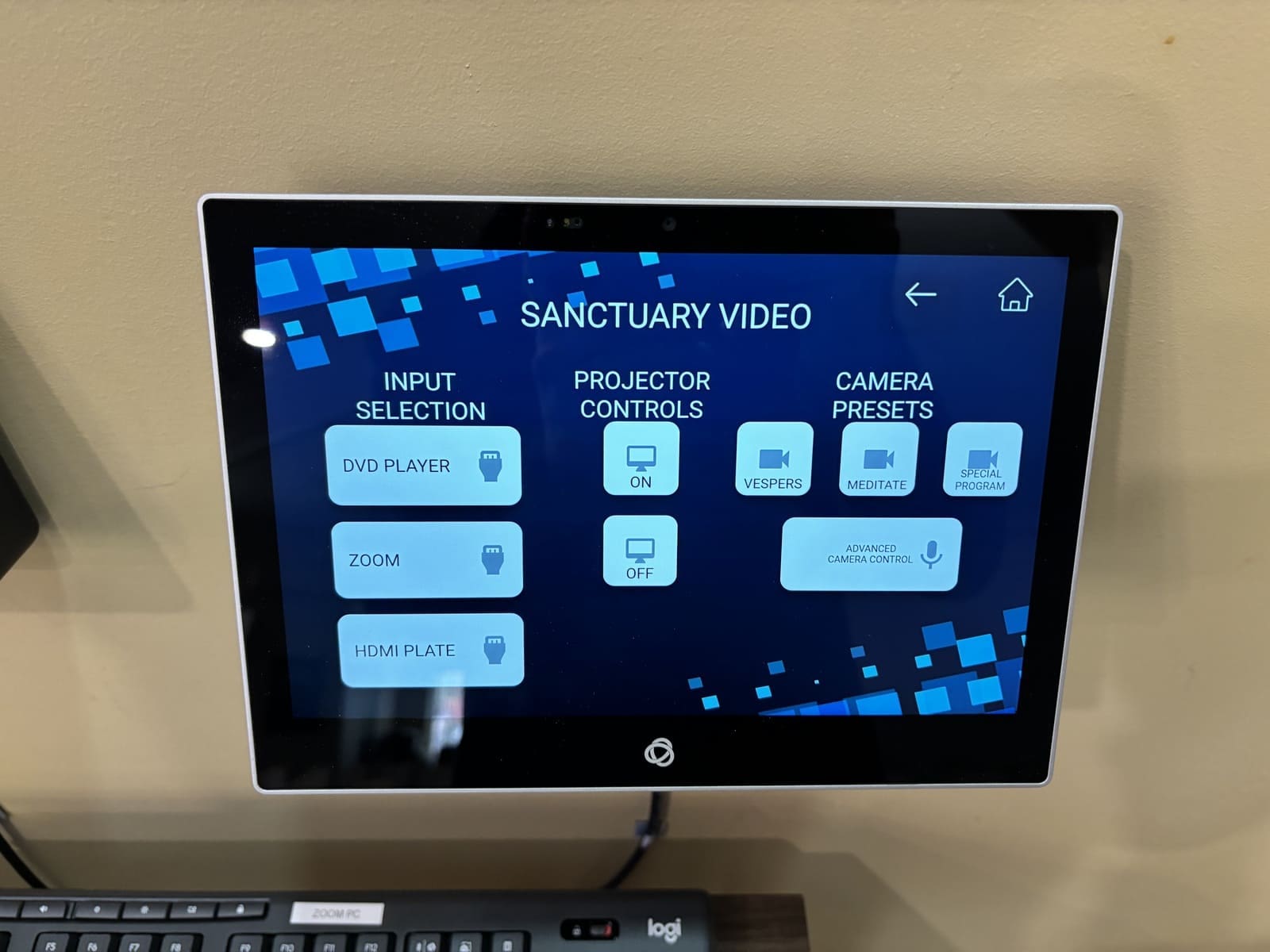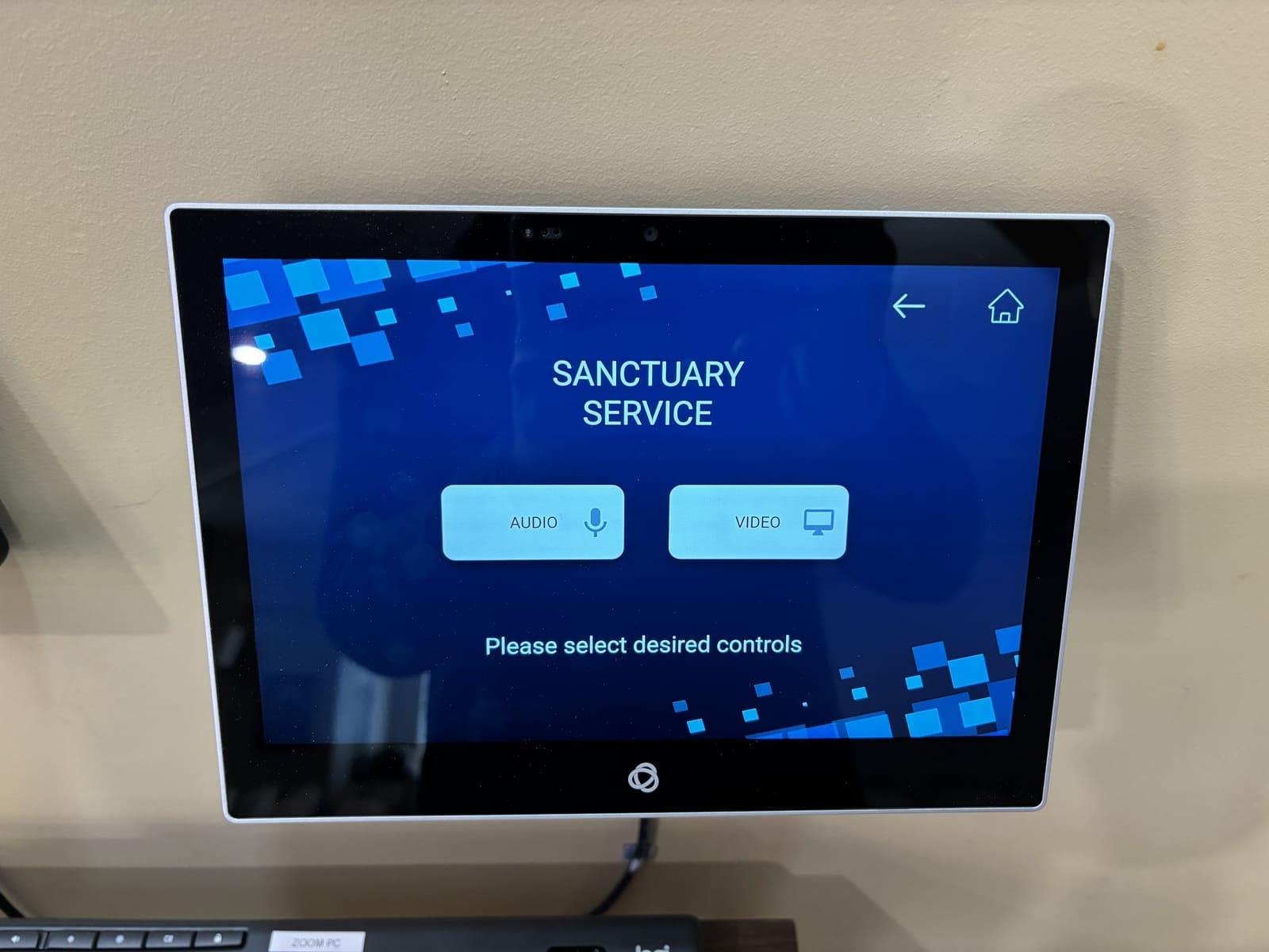 The initial window of the control panel allows the user to select the style of event they are hosting (sanctuary service, Zoom virtual conference call, live performance, etc.) and be directed to another custom page for event specific audio or video controls. This allows the end user group to control exactly the microphones and in-room equipment they need for that style of event, and nothing else.